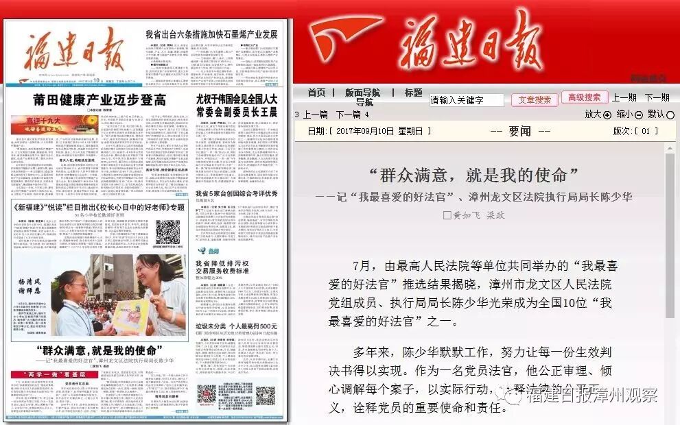 7月,由最高人民法院等单位共同举办的“我最喜爱的好法官”推选结果揭晓,漳州市龙文区人民法院党组成员、执行局局长陈少华光荣成为全国10位“我最喜爱的好法官”之一。