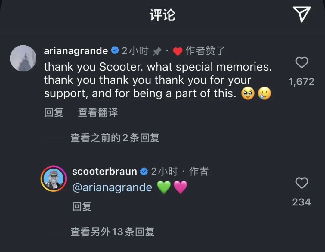 A妹Ariana Grande回应:谢谢你,Scooter,多么特别的回忆,谢谢谢谢你的支持,并成为其中的一部分。
