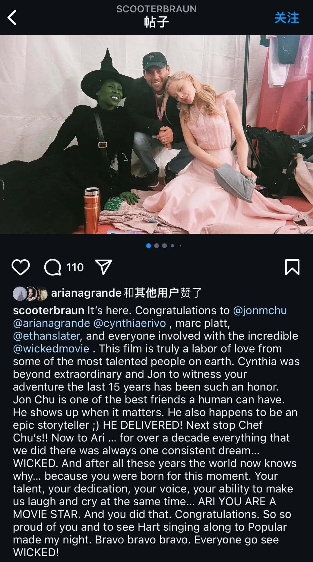 “Ari……十多年来,我们所做的一切都是为了一个始终如一的梦想……WICKED。经过这么多年,世界现在知道了为什么……因为你就是为这一刻而生的。你的才华、你的奉献、你的声音、你让我们同时欢笑和哭泣的能力……ARI,你是一个电影明星。你做到了。恭喜你。我为你感到骄傲”
