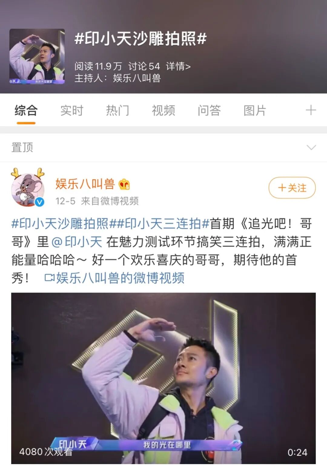 节目派来的第一个任务,要拍三张最有魅力的照片,别人都是当拍硬照,只有印小天把手搭在眉间,像是在眺望什么,姿势有一点滑稽,这就是追光的感觉,他解释。