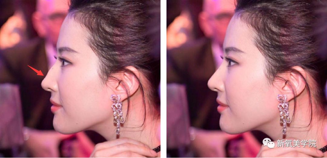 想要动鼻子的宝宝可以在沟通的时候问一下医生,是否可以在鼻头开始的地方做一个小的凹陷,这样一是可以比一根直线更自然,二是可以让鼻子看起来有【翘鼻】的感觉,会更加柔美生动,就像刘亦菲的鼻子这样,下图右边是把刘亦菲鼻节少掉的部分P了起来,把驼峰P下去,精致感就下降了,开始有过于顺滑的不自然的人工痕迹。