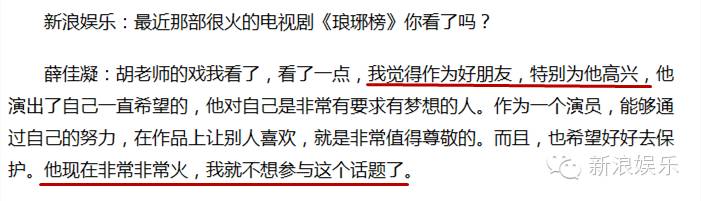 提到《琅琊榜》的时候,薛佳凝说自己身为好朋友特别为胡歌高兴。说演出好作品是胡歌的梦想,然后就是之前标题提及的那句:“他现在很火,我就不参与了。”