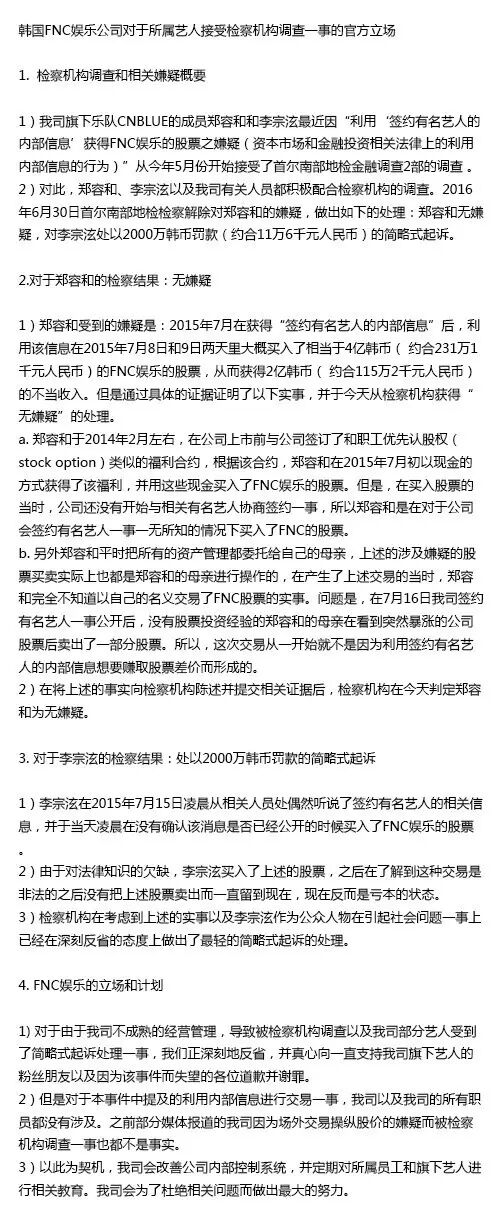FNC30日公开最近郑容和、李宗泫利用有名演艺人员聘请未公开情报买卖股票事件警察调查结果:“首尔南部地方检查厅30日