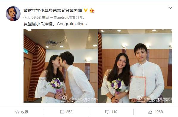 今日,黄秋生在微博晒出凤小岳与女友的亲密合照,并配文:“见证凤小岳婚礼。Congratulations!”