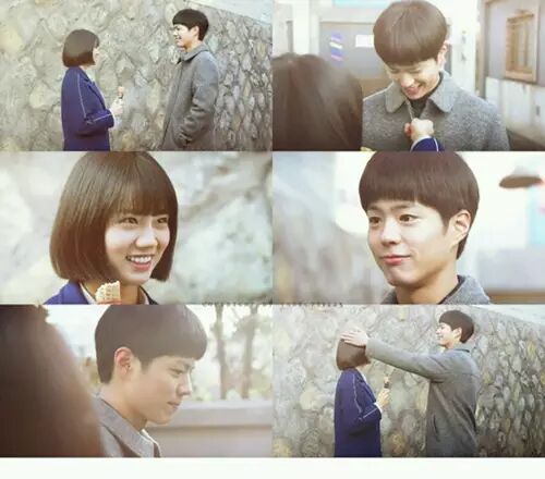 《狼族少年》,宋仲基带着朦胧的爱轻轻把手放在朴宝英头上。