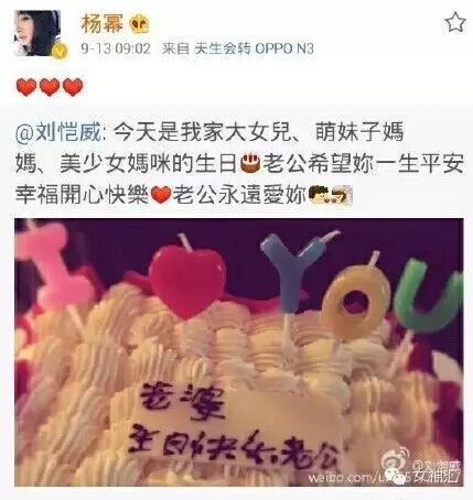 杨幂生日的时候, 刘恺威说:今天是我家大女兒、萌妹子媽媽、美少女媽咪的生日老公希望妳一生平安幸福開心快樂