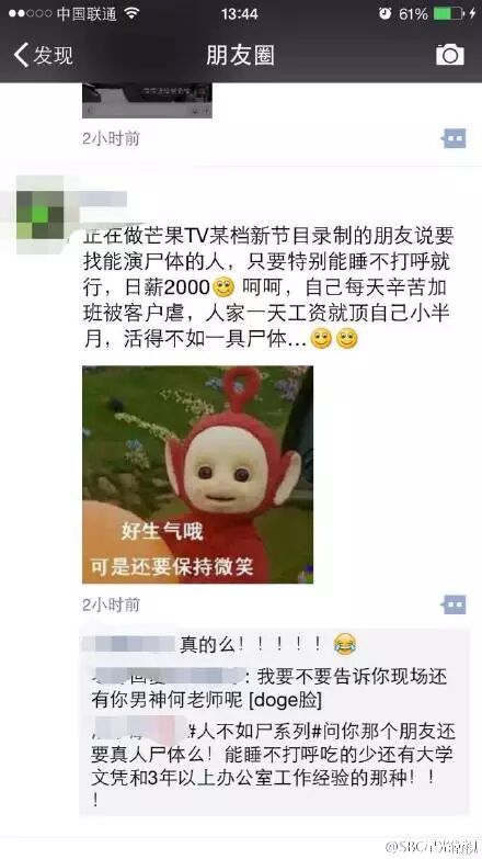 朋友圈曝光芒果TV内部人员在高薪寻找能演尸体的人,要求能睡不打呼日薪高达2000。网友推测“尸体演员”是要用于正在录制阶段的明星推理综艺节目《明星大侦探》。而一天2000块的酬劳外加能被各种明星上手摸的福利,真是让人想大喊:上你麻痹的班,演尸体去!!