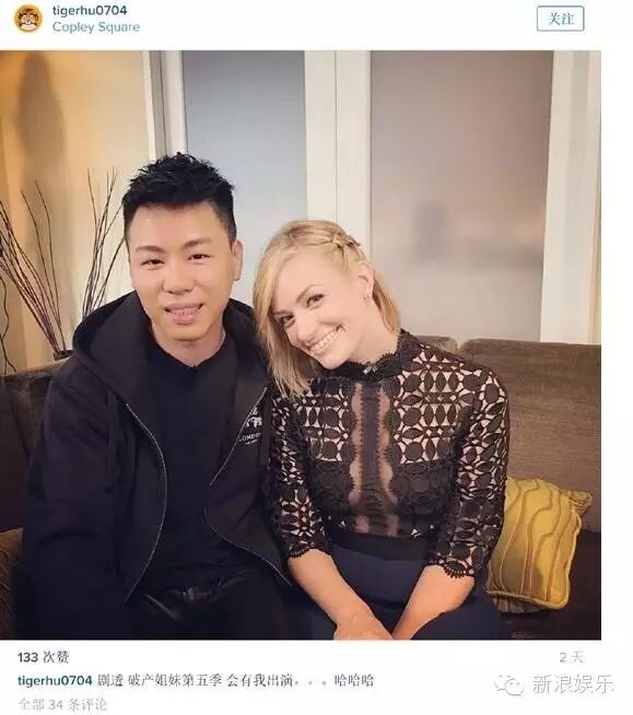 胡彦斌最近在ins上晒出与《破产姐妹》Caroline(贝丝·比厄饰)的合影,竟然自曝会在第五季亮相↓