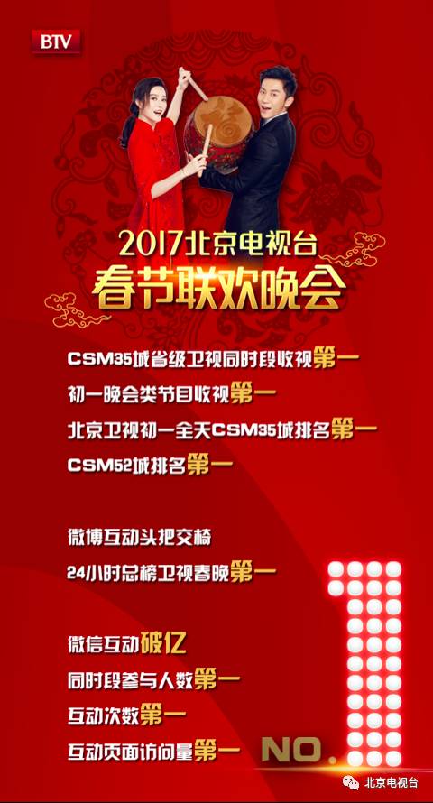 根据索福瑞发布的数据,2017年北京台春晚CSM35城收视率1.82%,排名省级卫视同时段第一,初一晚会类节目收视第一,北京卫视初一全天收视CSM35城排名第一、CSM52城排名第一;微博互动占据头把交椅,24小时总榜卫视春晚位居第一;微信互动破亿,同时段参与人数第一,互动次数第一,互动页面访问量第一。