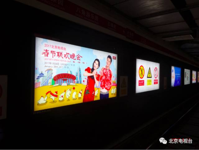 2017年1月1日起乘坐京沪、京广、京哈、沪昆四条主线,以及近30条支线上高铁列车的乘客可以观看到北京台春晚代言人范冰冰和李晨宣传片;包括北京站、北京西站、北京南站、盘古大观等地的大屏,北京城市电视的户外屏幕、楼宇屏幕,北京地铁灯箱广告;北京工美博物馆、北京西单图书大厦、华联商场、BHG超市、北京剧院联盟、大中电器、京津两地的星美集团影院等店面内都可以看到北京台春晚的相关内容信息。此外,在上海、沈阳、南京、石家庄等地,也可以通过户外和车身广告大屏了解到北京台春晚的内容。在济南、石家庄、长春、青岛四家电视台也播出了北京台春晚的相关内容。