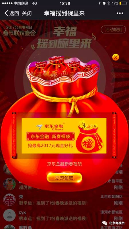 摇一摇互动内容对于春晚来说已经是标配,今年北京台春晚的摇一摇首次推出名家书画,彰显文化内涵。此外还有品牌福利、现金红包、实物奖品。这样的设计增加了春晚观众的收看黏性,起到了连接电视屏幕和手机端用户的作用,同时,100%的中奖率也给观众带来了真正的实在、实际和实惠。京东金融作为2017年北京台春晚的“首席互动合作伙伴”,在大年初一北京台春晚播出期间,京东金融以“下载APP领口令福袋”、“看春晚摇一摇送大奖”等互动方式向全国观众拜年,派送出总价值超过1亿元的惊喜福袋!