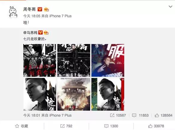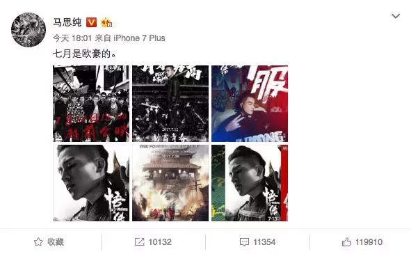 7月12日傍晚,马思纯在微博发出几张欧豪参演电影的海报,并暖心配文“七月是欧豪的”。真是高调给男友宣传不忘秀把恩爱!令网友大呼“吃了狗粮”、“欧豪是你的”。