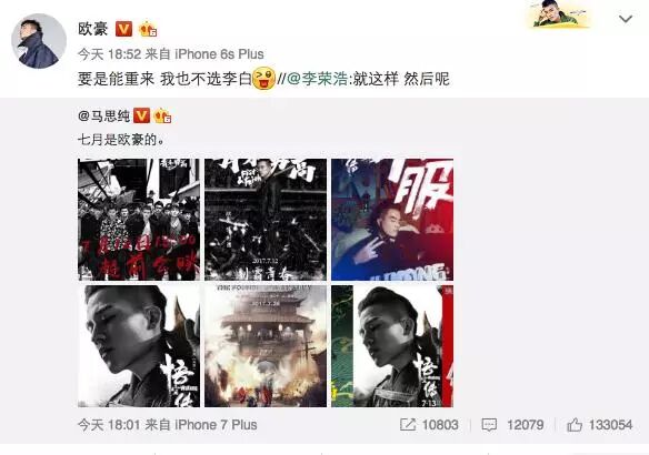 欧豪转发了李荣浩的微博说道:“要是能重来,我也不选李白。”这句话有意思。要知道,头晚马思纯可是在微博发了长文对寿星李荣浩先生表达了自己内心无比的情谊啊。欧豪的言外之意便是,即便现在重来,李荣浩站在马思纯面前,她也不会选李白。(李荣浩有首歌叫《李白》)啊哈哈哈,厉害了我的豪!