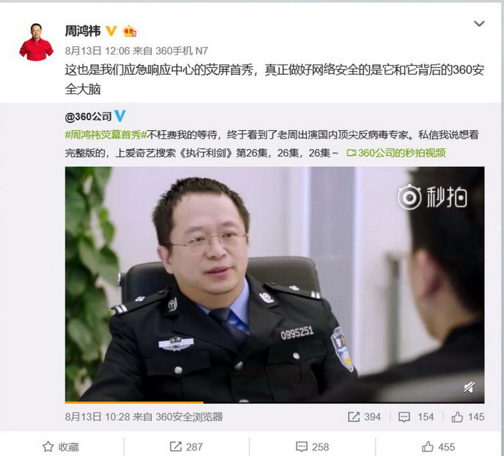 这不是谣传,是事实。8月13日,周鸿祎和360的微博开始同时为这部名为《执行利剑》电视剧打call,周鸿祎首次“触电”,剧中出演一名国内顶尖的反病毒专家。你还别说,一身警察制服穿在周鸿祎身上还真像那么回事。但人家绝对不是人傻钱多,冲着制服诱惑打个酱油才去的。精明的周鸿祎在剧中卖力地宣传了一把“360 应急响应中心”和“安全大脑”(想看周鸿祎演技如何,上爱奇艺搜索《执行利剑》第26集)。