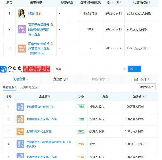 11月3日,记者从某眼查APP获悉,西安嘉行影视传媒股份有限公司近日更新股东信息显示,杨幂已退出该公司股东,此前杨幂持股约15.19%。目前,杨幂关联的9家企业中3家为存续状态,包括上海杨幂文化工作室、上海杨幂文化传媒中心、上海杨幂影视文化工作室,均与嘉行传媒无商业关联。