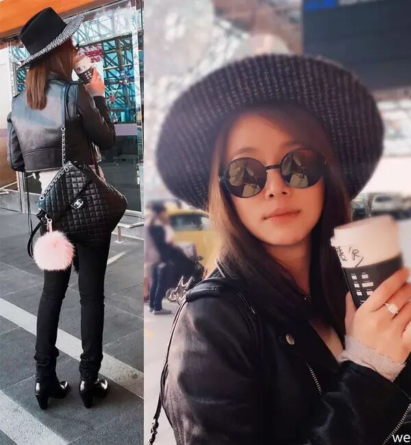 黑色小羊皮双肩包,搭配黑色皮衣和窄腿裤,心如女神看起来酷劲十足!