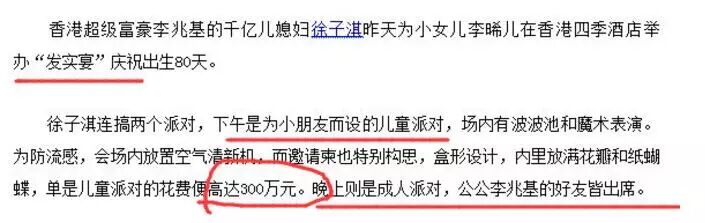 其实不止是现在的小儿子,徐子淇生下的其他三个孩子也一样,都是还在妈妈肚子里的时候就已经在花钱了。2007年徐子淇剖腹生大女儿,当时李家是把医院的整个11层都包下来做了产房的。后来2011年大儿子出生,李家又给旗下员工每人发了一万块港币的红包,给记者们每人发千元红包,李家诚还花了1.1亿港币买了艘游艇送给儿子当玩具。当时公公李兆基还为孙子成立了超过3亿元的成长基金。