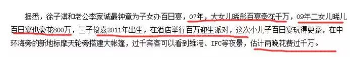 2009年的时候,徐子淇又生下二女儿,“百日宴”也是连摆两天,花了800多万港元,据说当天光酒店的场地租金就是180多万港元,连给嘉宾的小礼物都花了60多万港元,里里外外都透着一个大写的壕字。