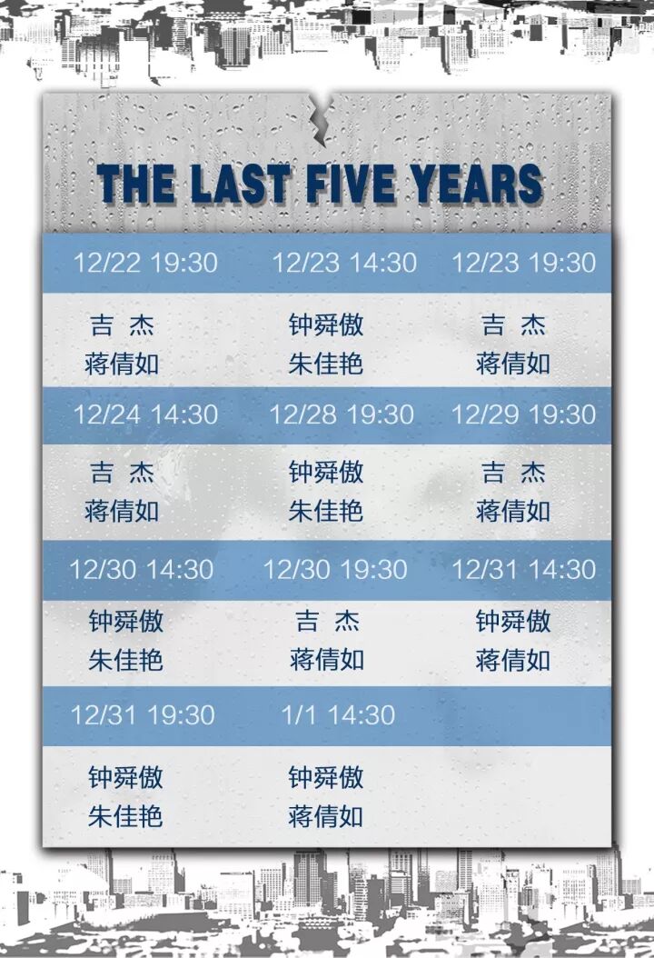 中文版《过去五年》将于12月22日至1月1日在上海ET剧场上演,1月24-25日在北京保利剧院上演。