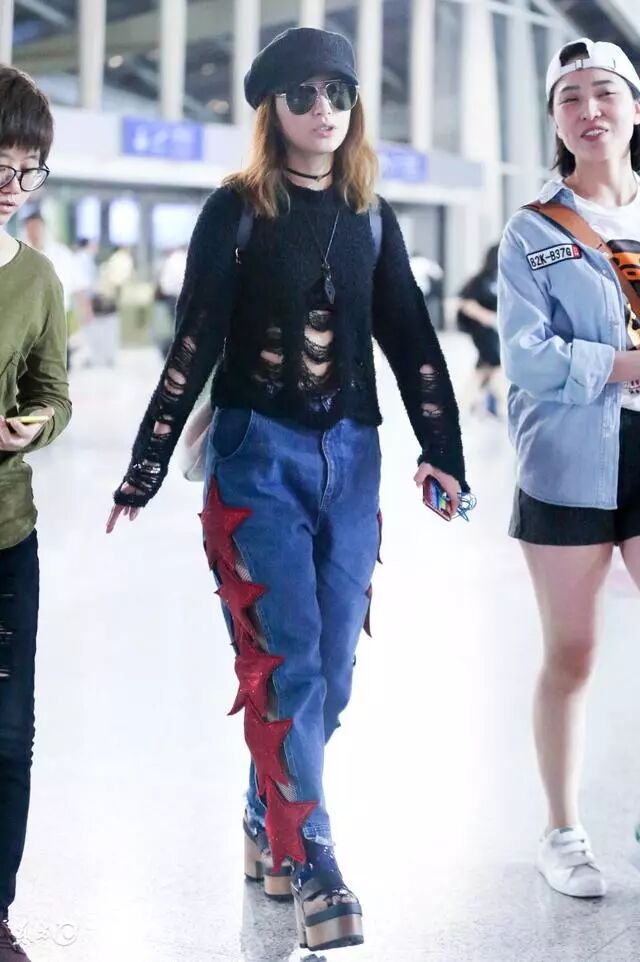 宽松的黑色毛衣搭配牛仔个性裤,真是不忍看啊,为什么一定要穿这条裤子呢!一个字,就是丑!