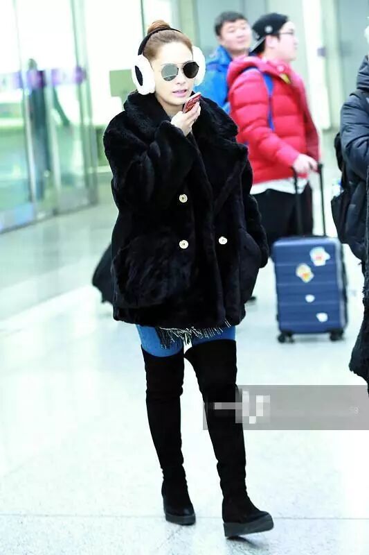 这身穿搭也太臃肿俗气了吧!简直就是大妈模样啊,黑色毛绒大衣搭浅蓝色的紧身裤,脚上搭黑色过膝长靴,也就你敢这样搭配啊!