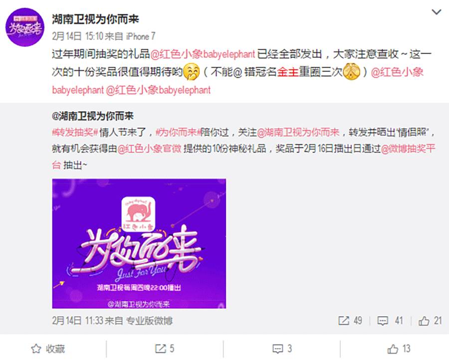 作为《为你而来》的独家冠名商红色小象也是相当给力,不仅给了×××××亿的赞助,还经常和节目官博一起搞事情~第一波神秘奖品已经发出啦,接下来送什么奖品呢?这就要看大家的热情度喽~