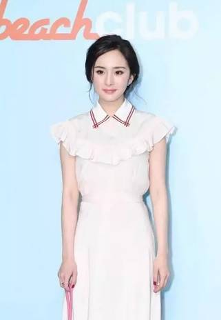 杨幂除了忙着拍戏,近几年为杂志拍摄也很多,miumiu开幕式一袭荷叶小礼裙,白色的飘飘欲仙之感,领结处红色棱线非常新颖。