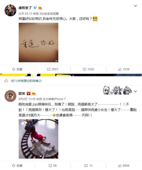 就在9月6日凌晨,《康熙》的官方微博突然发布了一条“相逢好似初相识,到老终无怨恨心。大家,还好吗?”,并配图“重逢,你好”。同时,还活跃地点赞了欧弟的微博。