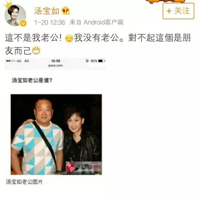 但汤宝如近日却发微博称自己并无丈夫。