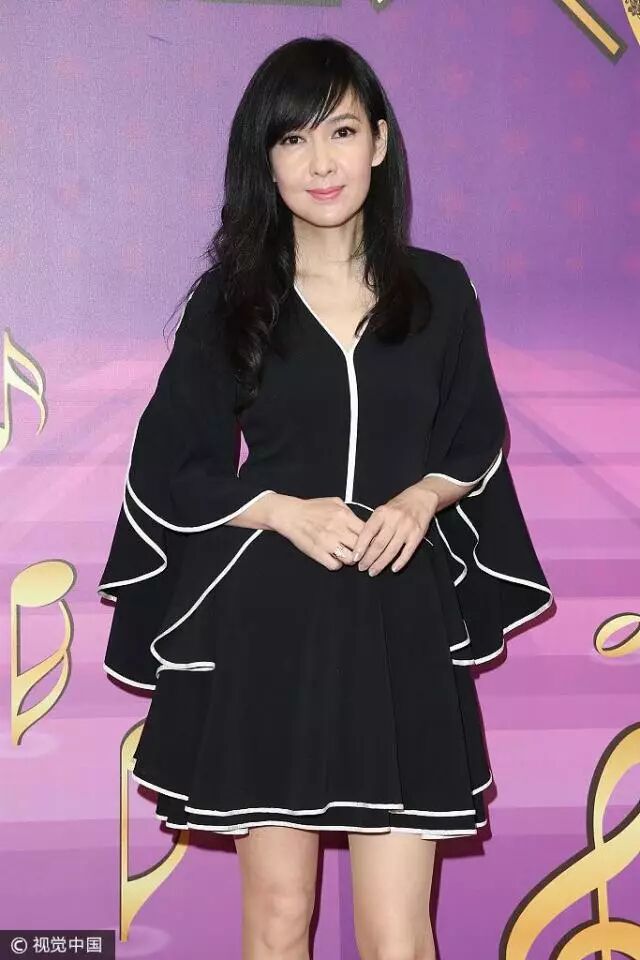 “玉女掌门”周慧敏身穿黑色连衣短裙,身材纤细,但却难掩脸上的岁月痕迹。