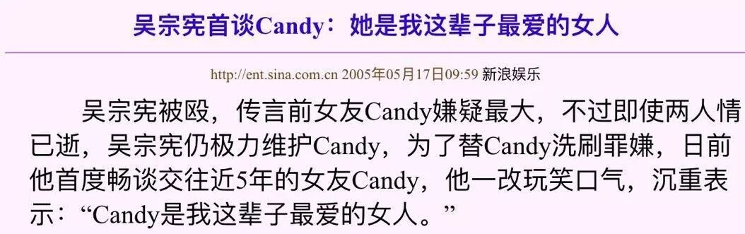 不久后,吴宗宪和Candy也分手了,但过了好几年,他还义正言辞在媒体面前公然喊话“Candy是我这辈子最爱的女人”。(求老婆孩子的心理阴影面积)