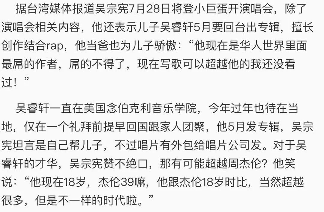 今年2月,吴宗宪又在自己的演唱会发布会上,说儿子5月要出专辑,扬言“他现在是华人世界里面最屌的作者…现在写歌可以超越他的我还没看过”。