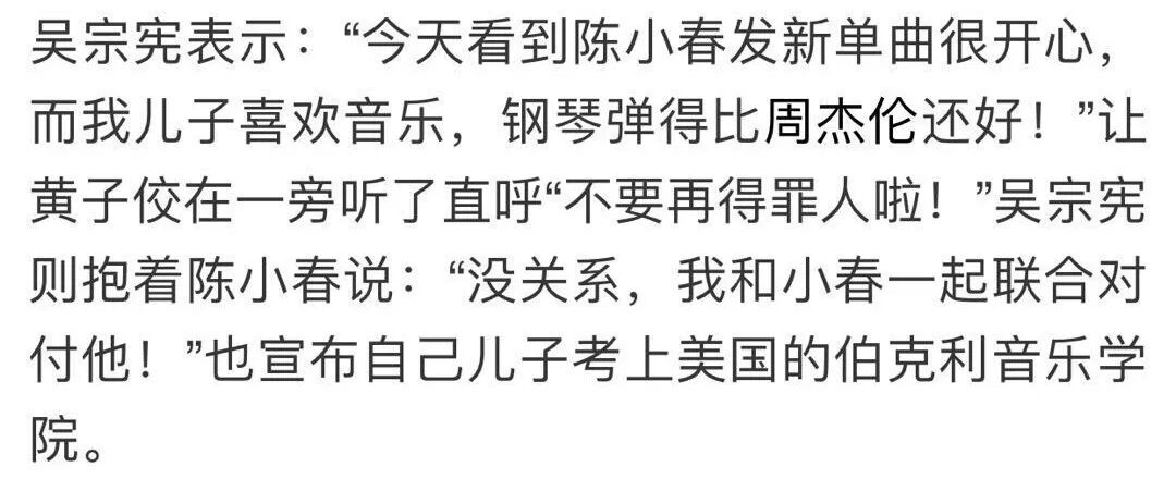 总之很厉害就是了。当年吴宗宪那个自豪啊!明明在帮陈小春发新单曲站台,却突然提到儿子被名校录取,还夸儿子“钢琴弹得比周杰伦还好”。