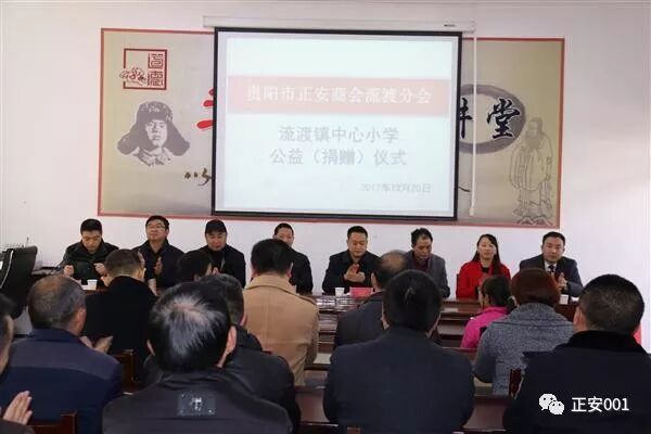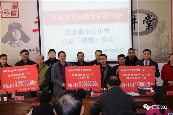 2017年12月20日上午10:50,贵阳市正安商会流渡分会在流渡镇中心小学会议室举行了公益捐赠活动:共捐赠保林、村台学校及中心小学校服270套(价值4.2万元),教学资源网络设备一套(价值19.8万元)。