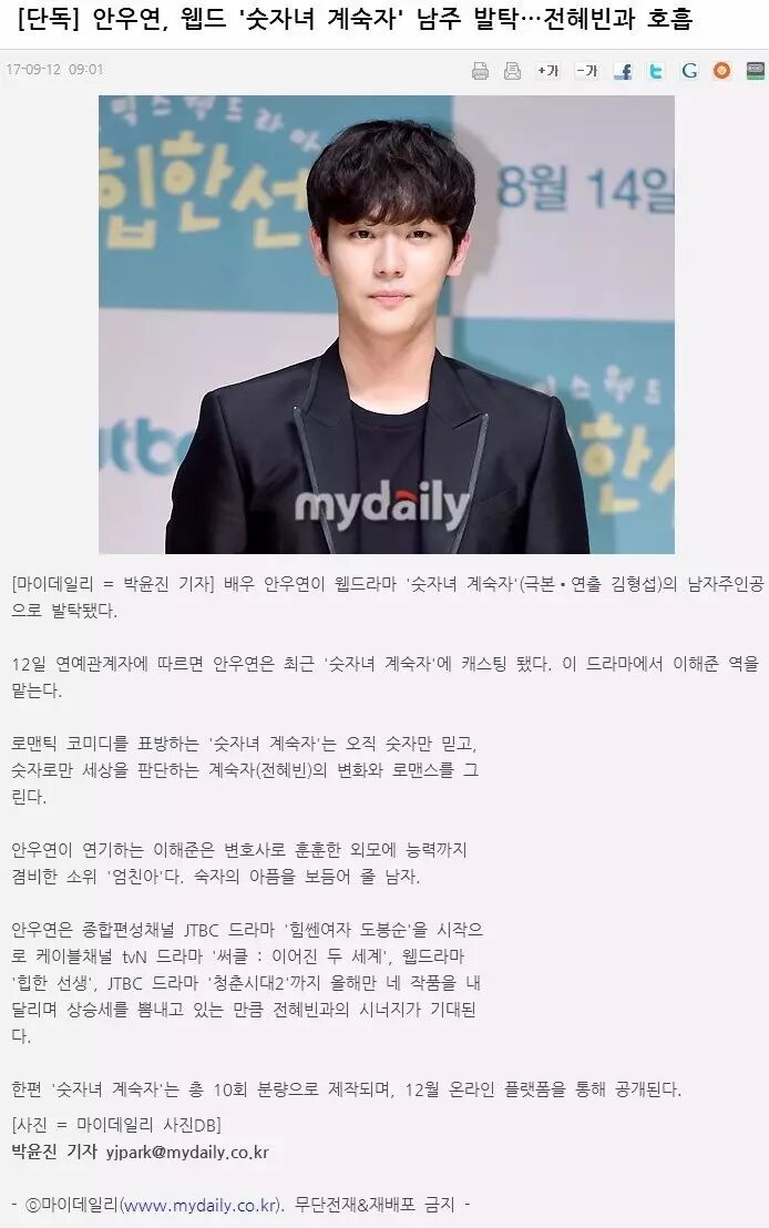 12日,据韩媒报道,演员安偶然确定出演网络剧《数字女季淑子》男主。