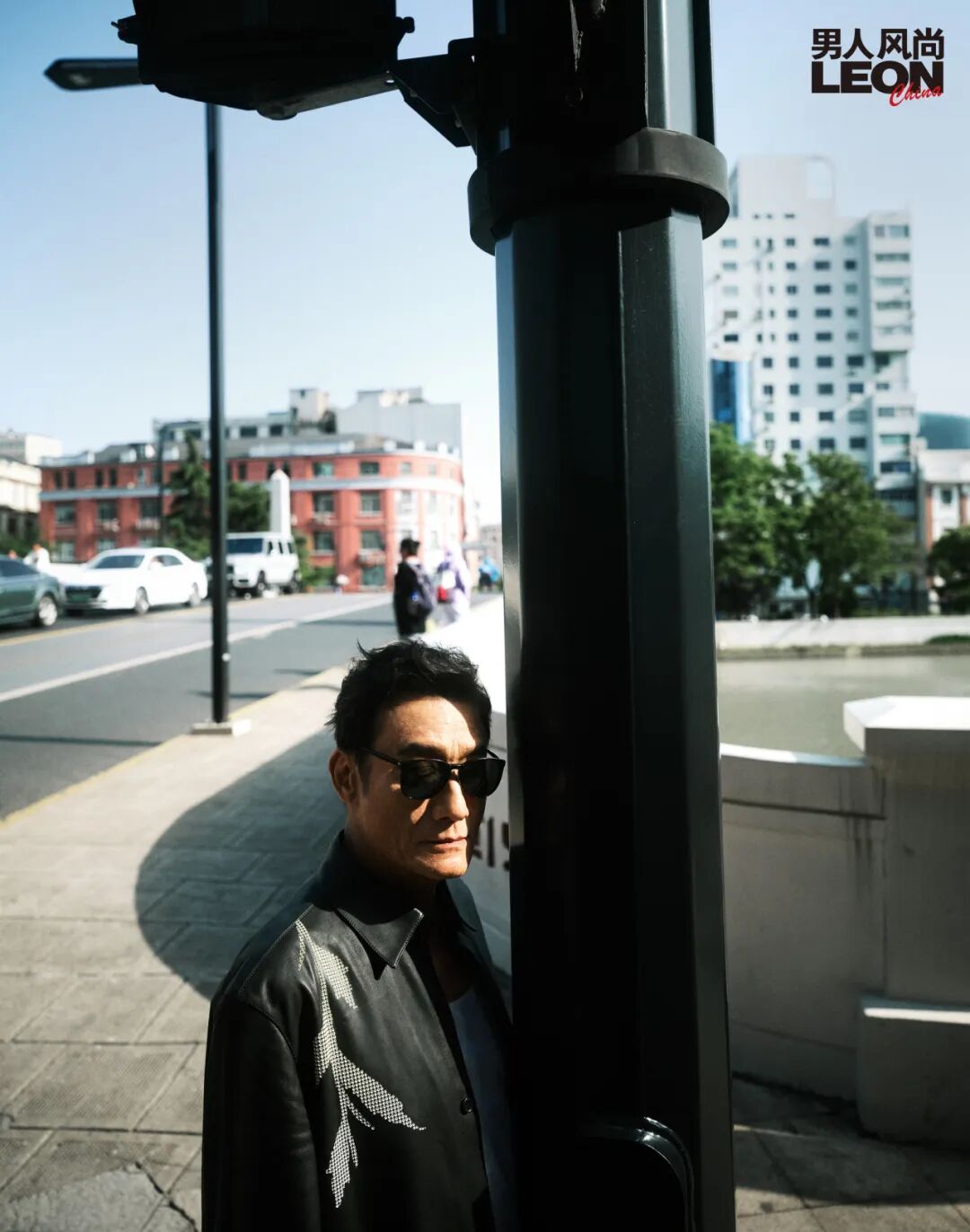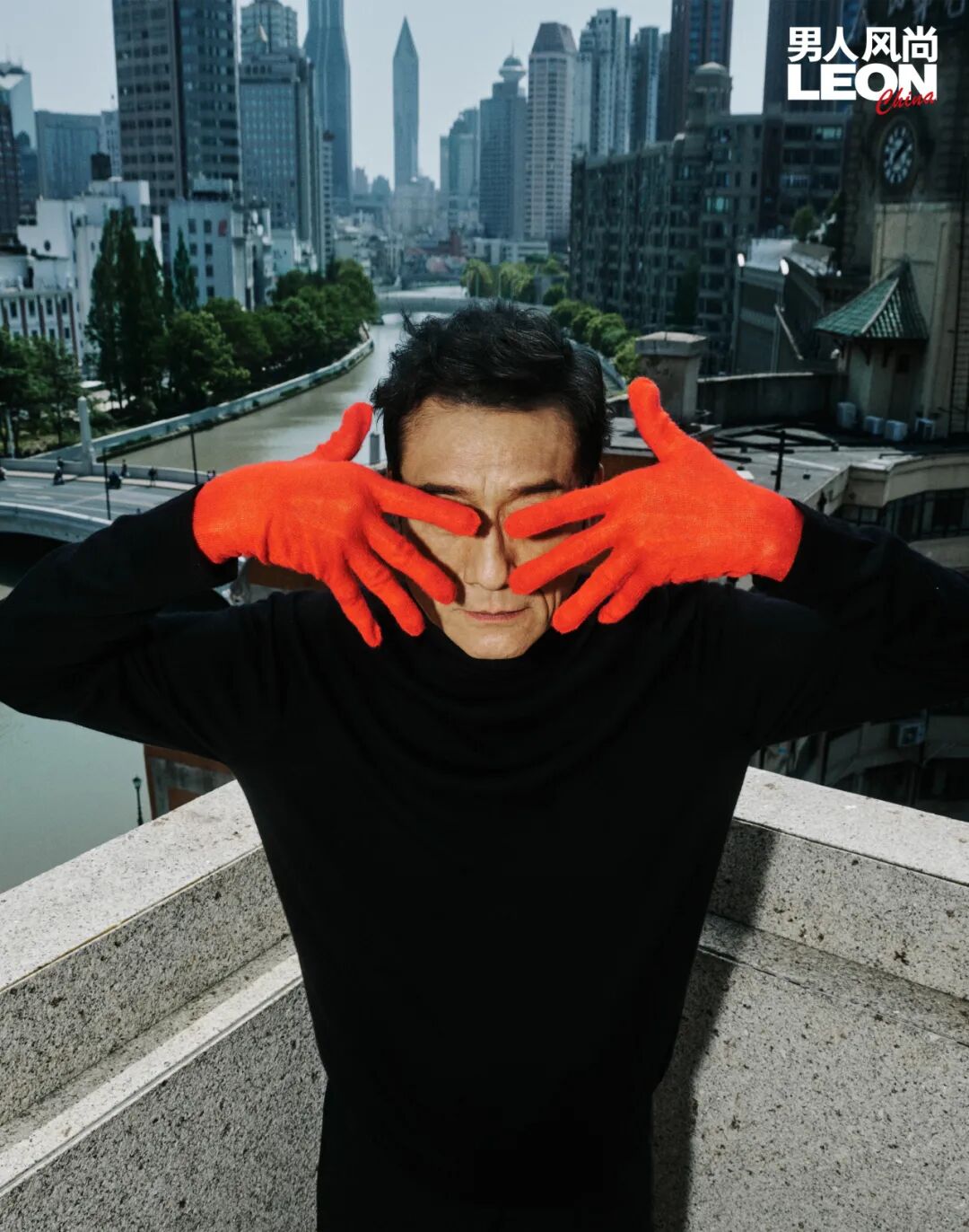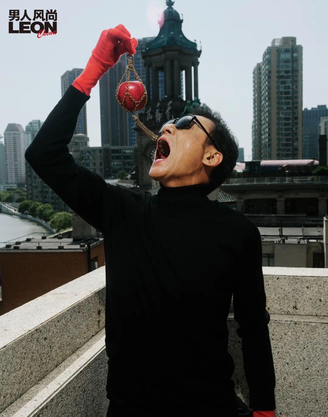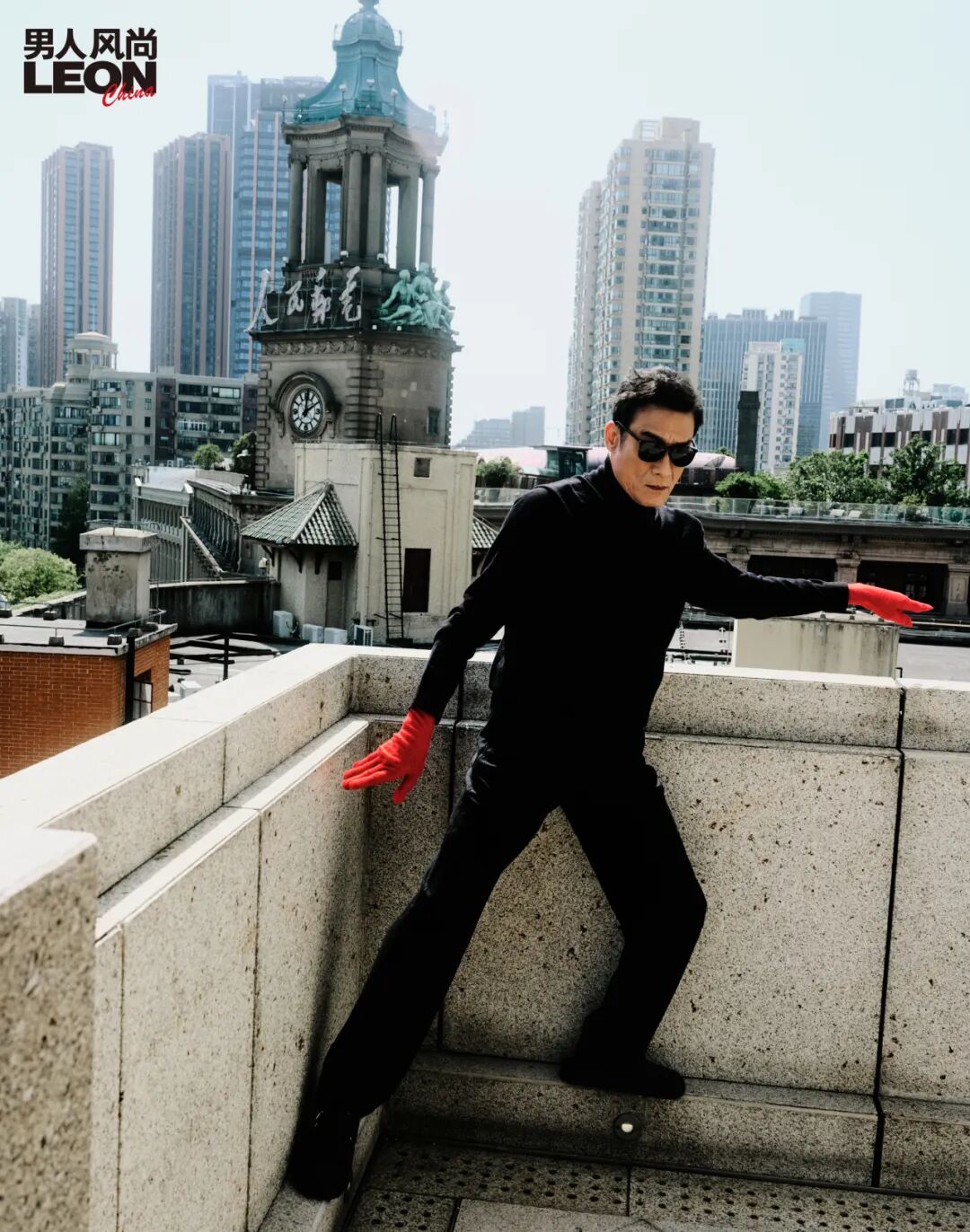 与其说紧张,实际是对工作的认真、专业和敬畏。于是,面对工作邀约,梁家辉总是尽力做出最好的回馈。就如当天拍摄,其中一个造型是一身黑衣,双手红色长手套。梁家辉需要站在露台边上,围栏出一个微微凸起的台阶,让摄影师可以带到他身后的天空和外滩建筑。那个位置其实并不好站,背后腾空,没可依靠借力的地方,只能两脚使力踩住。梁家辉二话没说,就站了上去,他调整身姿,摆出姿势,摄影师举起相机,他立刻给予回应,用肢体去展现时装,仿佛一场先锋默剧正在即兴演出。