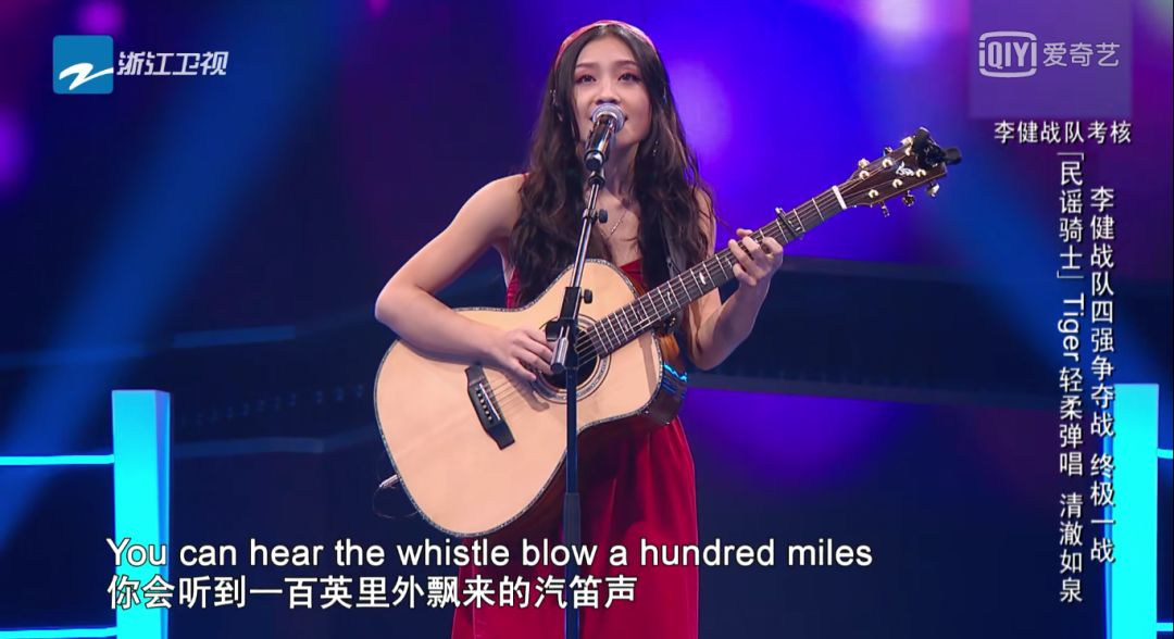 前晚收官的《好声音》节目上,民谣骑士tiger也在现场轻柔弹唱了《500 miles》。