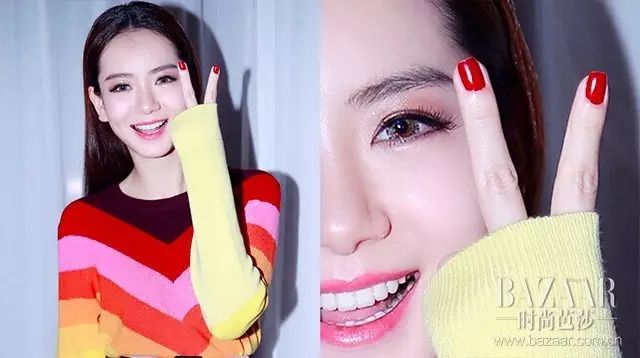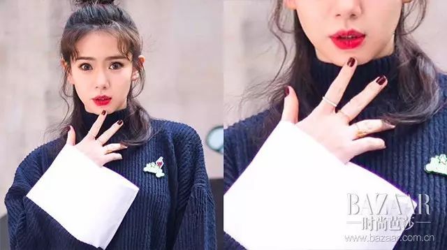 我们戚哥就是这么百变!偶尔甜美偶尔小女人的自由切换真是让人欲罢不能,爱都爱不够。这款女人味十足的红指甲搭配长发显然非常加分,而且她没有选择“应景”的红唇,而是粉色系嘴唇,尽显小女人气质!
