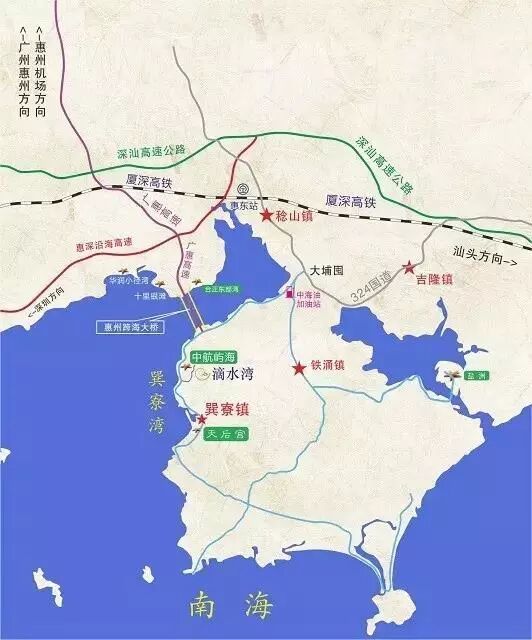 ◆ 惠州:广惠高速—海湾大桥—巽寮湾出口—中航元屿海--滴水湾度假酒店