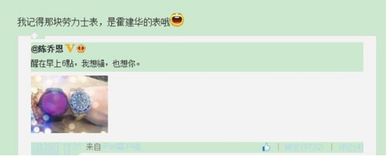 最大的证据之一是,她转发了陈乔恩这条微博,直接说这是霍建华的手表: