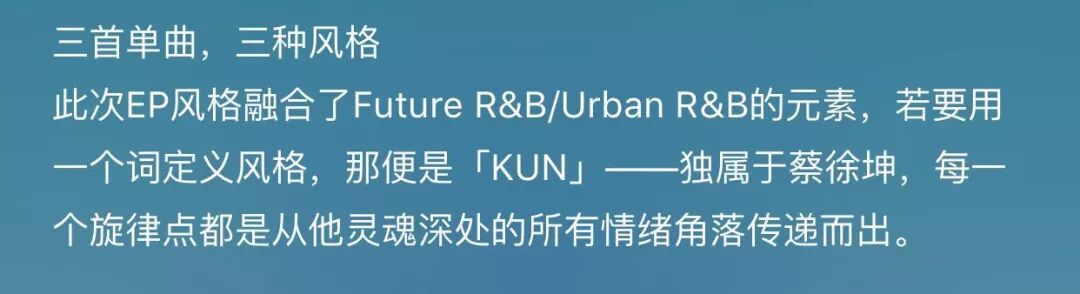 坤坤还建立了一个新的音乐风格呢!这种音乐风格将Future R&B与Urban R&B完美结合。坤坤的官方团队都告诉我们答案了,这种音乐风格叫作KUN!独属于蔡徐坤!抄袭什么的不存在的。毕竟我们的Kunkun创立的音乐风格——Kun,每一个“旋律点”都是他的灵魂深处的映射哦,那必须得是Kunkun独享(不过“旋律点”是什么玩意儿?这又是哪个没文化硬装文笔好的人扯出来的又名。你要说的是音阶吧?)。