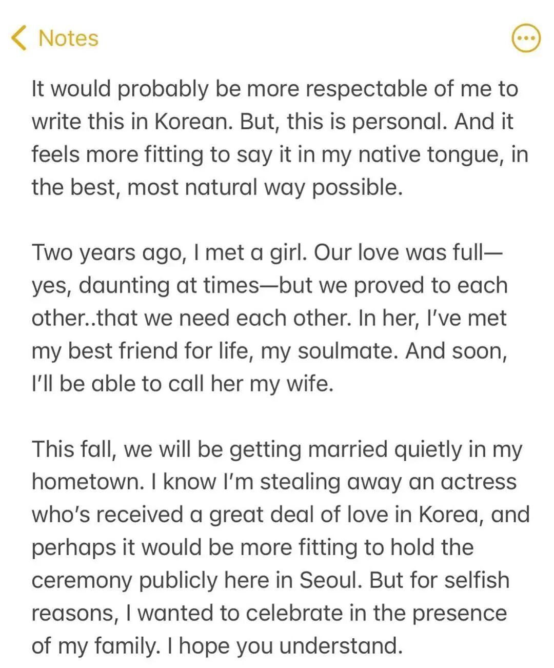 并且解释了两人之所以选择在纽约举办婚礼,是因为想在这个人生重要时刻与家人一起度过,所以才没有选择在韩国办公开婚礼。