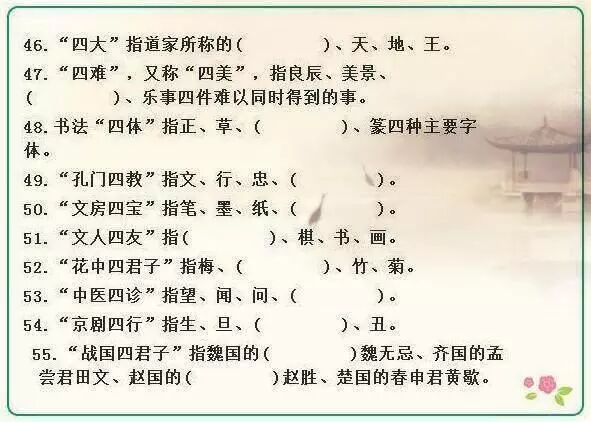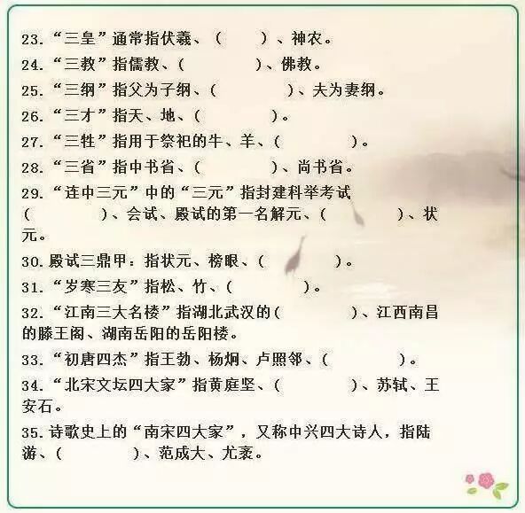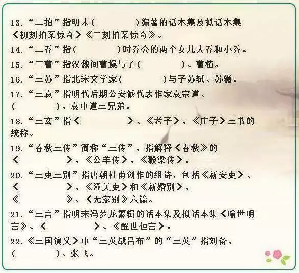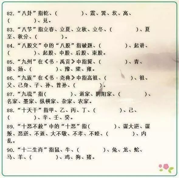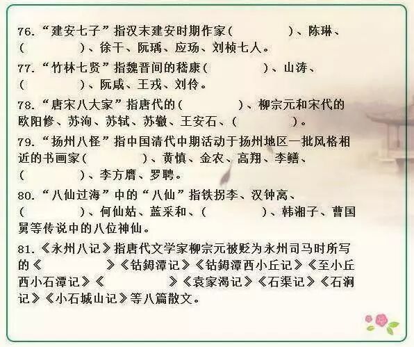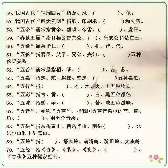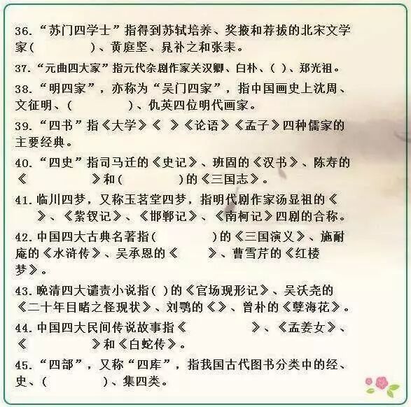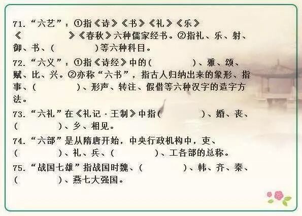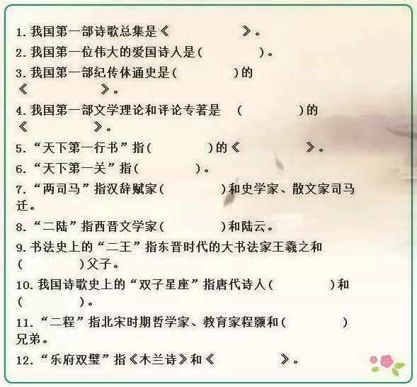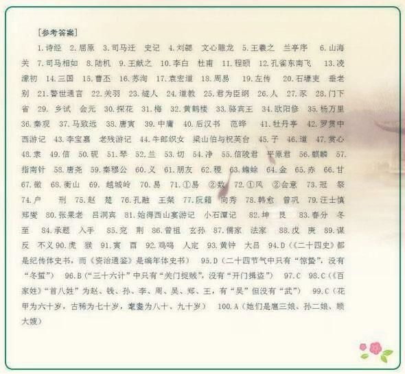 鉴于很多家长向我反映孩子这方面的知识掌握的不够扎实,所以老师特意为大家整理100道语文考试中常考的国学常识题,帮助孩子提升成绩、应对考试,增强文化底蕴。建议家长们可以为孩子打印出来,不仅可以丰富孩子的知识,还可以提高孩子的文学素养!