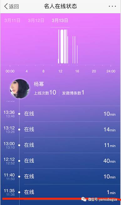 粉丝拿出杨幂的微博在线时间来证明,杨幂11点35就上了一分钟微博,而那就是秒删微博发布的时间。粉丝的逻辑是:如果杨幂看了那么长的微博问答就不会一分钟就下线。