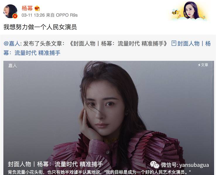 而杨幂转发这个封面访问的表态是:要做人民女演员。