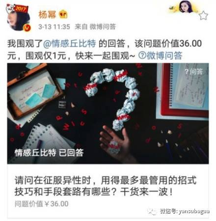 因为她页面上出现了这样一条内容:围观问答“征服异性最管用的招式”。