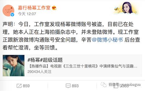 看截图,这条微博发布于今天11点35分然后被秒删,工作室在中午12点07分发布声明被盗号了。