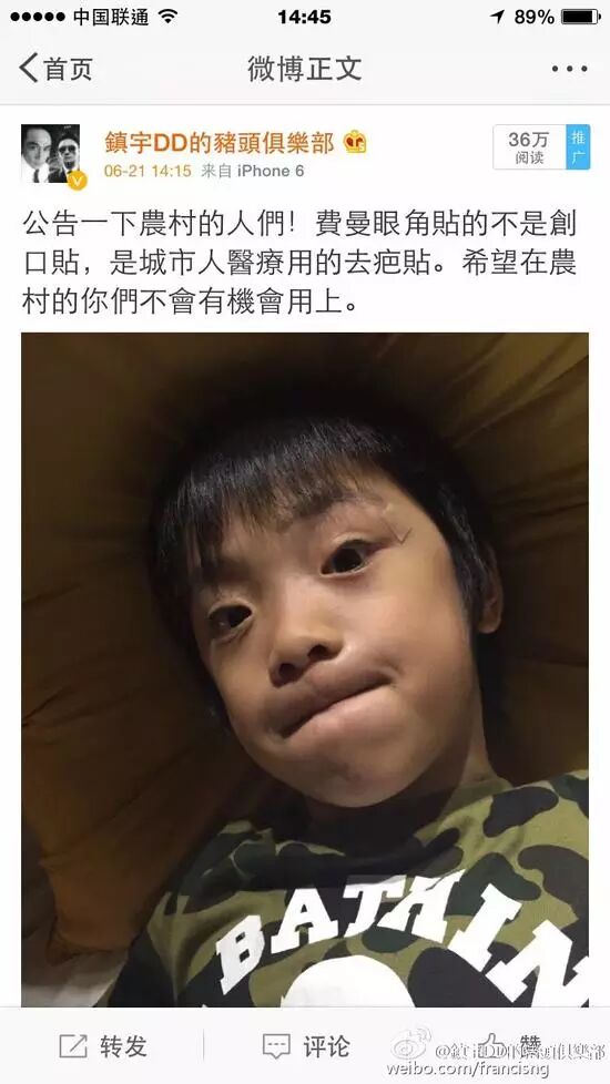 6月21日,吴镇宇晒出费曼的一张照片,费曼左眼伤口处有一个类似创可贴的祛疤贴。因网友们以为是创可贴,吴镇宇专门在微博上作出说明:“公告一下农村的人们!费曼眼角贴的是城市人医疗用的祛疤贴。希望在农村的你们不会有机会用上。”此话一出,便一发不可收拾,直接炸了锅,而吴镇宇也继续更博,连发5条微博与网友对战。