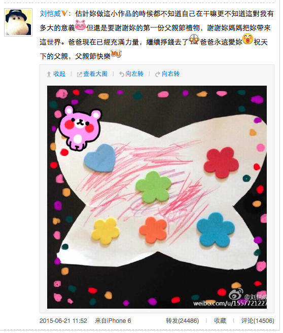 2014年6月1日杨幂生下女儿小糯米,刘恺威也终于当了爸爸。在一年多过去了的今天,在刘恺威的第一个父亲节,小糯米用自己稚嫩的小手给爸爸送上了最珍贵的礼物。