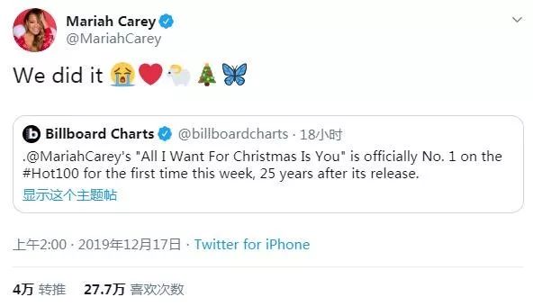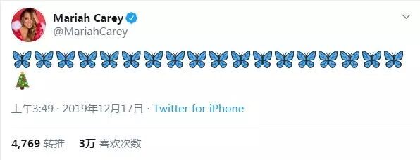 《All I Want For Christmas Is You》登顶后,Mariah Carey第一时间发表状态,虽说大都是emoji表情,也难掩喜悦。